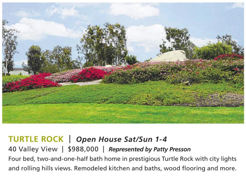 TURTLE ROCK | Open House Sat/Sun 1-4 40 Valley View | $988,000 | Represented by Patty Presson Four bed, two-and-one-half bath home in prestigious Turtle Rock with city lights and rolling hills views. Remodeled kitchen and baths, wood flooring and more.