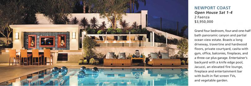 NEWPORT COAST Open House Sat 1-4 2 Faenza $3,950,000 Grandfourbedroom,four-and-one-half bath panoramic canyon and partial ocean view estate. Boasts a long driveway, travertine and hardwood floors, private courtyard, casita with gym, office, balconies, fireplaces, and a three-car plus garage. Entertainer’s backyard with a knife edge pool, Jacuzzi, an elevated fire lounge, fireplace and entertainment bar with built-in flat screen TVs, and vegetable garden. See also