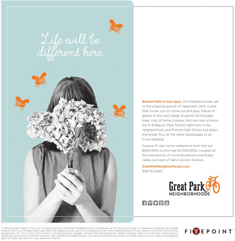 Life will be different here. Beacon Park is now open. Our freshest answer yet to the ongoing pursuit of happiness. With a park that invites you to come out and play. Places to gather in the cool shade of grand old heritage trees. Lots of home choices. And two new schools: the K-8 Beacon Park School right here in the neighborhood, and Portola High School just down the street. Plus all the other advantages of an Irvine address. Explore 15 new home collections from the low $600,000s to the high $1,000,000s. Located at the intersection of Irvine Boulevard and Ridge Valley, just east of Sand Canyon Avenue. GreatParkNeighborhoods.com 949.733.3260 © 2013 Heritage Fields El Toro, LLC. All rights reserved. Great Park Neighborhoods is a trademark of and the bicycle logo is a registered trademark of Heritage Fields El Toro, LLC (Heritage Fields) dba Great Park Neighborhoods used for the marketing of new home neighborhoods in Irvine, California. Five Point Communities Management, Inc. (Five Point Communities) is the development manager of Great Park Neighborhoods. Neither Heritage Fields nor Five Point Communities is designing, constructing or offering homes for sale in Great Park Neighborhoods. All proposed amenities are subject to change without notice. Lifestyle photography does not reflect any ethnic or racial preference. (10/15)