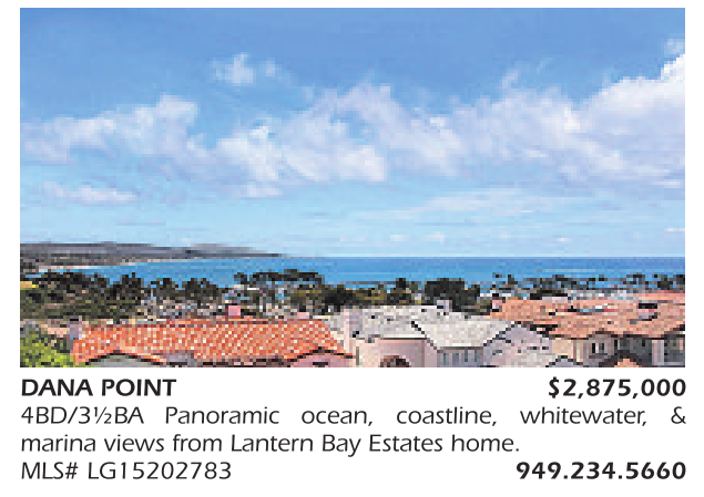 DANA POINT $2,875,000 4BD/3½BA Panoramic ocean, coastline, whitewater, & marina views from Lantern Bay Estates home. MLS# LG15202783 949.234.5660