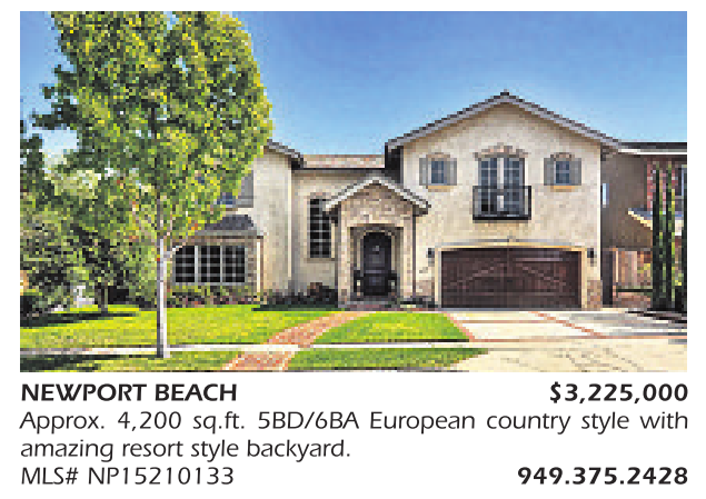 NEWPORT BEACH $3,225,000 Approx. 4,200 sq.ft. 5BD/6BA European country style with amazing resort style backyard. MLS# NP15210133 949.375.2428