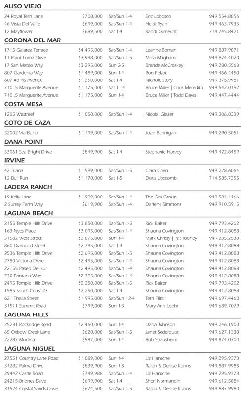 24 Royal Tern Lane $708,000 Sat/Sun 1-4 Eric Lobosco 949.554.8856 46 Vista Del Valle $699,000 Sat/Sun 1-4 Heidi Ryan 949.463.7935 12 Mayflower $689,500 Sat 1-4 Randi Cymerint 714.745.8421 CORONA DEL MAR 1715 Galatea Terrace $4,495,000 Sat/Sun 1-4 Leanne Boman 949.887.9871 11 Point Loma Drive $3,998,000 Sat/Sun 1-5 Mina Maghami 949.874.4020 17 San Mateo Way $3,295,000 Sun 2-5 Brenda McCroskey 949.280.5563 807 Gardenia Way $1,489,000 Sun 1-4 Ron Felsot 949.466.4450 607 #B Iris Avenue $1,250,000 Sat 1-4 Nichole Story 949.375.9981 710 .5 Marguerite Avenue $1,175,000 Sat 11-4 Bruce Miller |Chris Meredith 949.542.0192 710 .5 Marguerite Avenue $1,175,000 Sun 1-4 Bruce Miller |Todd Davis 949.447.4444 COSTA MESA 1285 Westreef $1,050,000 Sat/Sun 1-4 Nicolai Glazer 949.306.8339 COTO DE CAZA 32002 Via Buho $1,199,000 Sat/Sun 1-4 Joan Bannigan 949.290.5051 DANA POINT 33061 Sea Bright Drive $849,900 Sat 1-4 Stephanie Harvey 949.422.8459 IRVINE 42 Triana $1,599,000 Sat/Sun 1-5 Clara Chen 949.228.6064 12 Bull Run $1,170,000 Sat 1-5 Doris Lipscomb 714.585.7355 LADERA RANCH 19 Kelly Lane $1,999,000 Sat/Sun 1-4 The Ora Group 949.584.4466 2Surrey Farm Way $619,900 Sat/Sun 1-4 Darlene Simmons 949.910.5915 LAGUNA BEACH 2155 Temple Hills Drive $3,850,000 Sat/Sun 1-5 Rick Balzer 949.793.4202 163 Nyes Place $3,095,000 Sat/Sun 1-4 Shauna Covington 949.412.8088 31582 West Street $2,875,000 Sun 1-4 Mark Christy |Pat Toohey 949.235.2538 860 Diamond Street $2,795,000 Sat 1-4 Shauna Covington 949.412.8088 2536 Temple Hills Drive $2,695,000 Sat/Sun 1-5 Shauna Covington 949.412.8088 2780 Victoria Drive $2,495,000 Sat/Sun 1-4 Shauna Covington 949.412.8088 22155 Paseo Del Sur $2,495,000 Sat/Sun 1-4 Shauna Covington 949.412.8088 730 Fontana Way $2,395,000 Sat/Sun 1-4 Shauna Covington 949.412.8088 2495 Temple Hills Drive $2,350,000 Sat/Sun 1-5 Rick Balzer 949.793.4202 1585 South Coast 23 $2,250,000 Sat 1-4 Shauna Covington 949.412.8088 621 Thalia Street $1,995,000 Sat/Sun 12-4 Terri Flint 949.697.4460 31511 Summit Road $799,000 Sun 1-5 Mary Ann Loehr 949.689.7029 LAGUNA HILLS 25231 Rockridge Road $2,450,000 Sun 1-4 Dana Johnson 949.246.1900 65 Oxbow Creek Lane $620,000 Sat/Sun 1-5 Janet Sederquist 949.627.1330 22287 Modina $587,000 Sun 1-4 Bob Strausheim 949.874.0300 LAGUNA NIGUEL 27551 Country Lane Road $1,089,000 Sun 1-4 Liz Hansche 949.295.9373 31282 Palma Drive $839,900 Sun 1-5 Ralph &Denise Kuhns 949.887.9985 29442 Castle Road $749,988 Sat/Sun 1-4 Liz Hansche 949.295.9373 24215 Briones Drive $699,900 Sat 1-4 Sheri Normandin 949.612.5884 31524 Crystal Sands Drive $674,500 Sat/Sun 1-5 Ralph &Denise Kuhns 949.887.9980