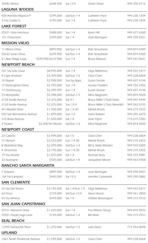 30482 Almira $648,900 Sat 12-4 Zohre Ghazi 949.350.5712 LAGUNA WOODS 928 Avenida Majorca P $299,000 Sat/Sun 1-4 Cathleen Pryor 949.230.1834 3Via Castilla G $199,000 Sun 1-4 Cathleen Pryor 949.230.1834 LAKE FOREST 25321 Vista Hermosa $488,000 Sun 1-4 Kevin Hill 949.677.6500 101 Chaumont $399,000 Sat 1-4 Joan Bannigan 949.290.5051 MISSION VIEJO 11 Mirino Drive $899,900 Sat/Sun 1-4 Bob Strausheim 949.874.0300 25632 Santo Drive $699,900 Sat/Sun 1-4 Bob Strausheim 949.874.0300 51 Aliso Ridge Loop $599,900-$619,900 Sun 1-4 Bruce Robison 949.547.0641 NEWPORT BEACH 107 Via Lido Soud $8,995,000 Sun 1-4 Olga Matthews 949.922.5577 9Cape Andover $3,399,000 Sat/Sun 1-5 Clara Chen 949.228.6064 10 Napoli $2,998,000 Sun by Appt. Susan Sinclair 949.697.4144 17 Rockingham Drive $2,795,000 Sun 1-4 Hunter Fedden 949.702.2902 17 Cherbvourg $2,399,999 Sun 1-4 Susan Sinclair 949.697.4144 23 Montpellier $2,398,000 Sat/Sun 1-5 Mina Maghami 949.874.4020 2120 Seville Avenue $2,375,000 Sat 9-1 Bruce Miller |Todd Davis 949.447.4444 2120 Seville Avenue $2,375,000 Sun 12-4 Bruce Miller |Chris Meredith 949.542.0192 44 Hillsdale Drive $1,950,000 Sat 1-4:30 Mehdi Khosh 949.219.2425 543 San Bernardino Avenue $1,899,000 Sun 1-4 Hanz Radlein 949.245.4470 516 Bolsa Avenue $1,650,000 Sat 1-4 Sean Flynn 714.675.5283 3Toulon $6,500 Per Month Sat/Sun 1-5 Mina Maghami 949.874.4020 NEWPORT COAST 22 Catania $3,499,000 Sat 1-5 Clara Chen 949.228.6064 17 Vernon $2,525,000 Sun 1-4:30 Mehdi Khosh 949.219.2425 8Waterford Way $2,399,000 Sat/Sun 1-4 Bill &Stella Worden 949.922.0305 4Vincennes $2,195,000 Sun 1-4:30 Mehdi Khosh 949.219.2425 19 Via Amanti $1,075,000 Sat 1-4 Nichole Story 949.375.9981 33 Auvergne $920,000 Sat/Sun 1-4 Jacqueline Moran 949.463.9358 RANCHO SANTA MARGARITA 7Sequero $899,900 Sat/Sun 1-4 Joan Bannigan 949.290.5051 164 Via Lampara $445,000 Sat 10-3 Jennifer Castaneda 949.290.2882 SAN CLEMENTE 32 Via Del Tesoro $3,195,000 Sat 1-4/Sun 1-5 Olga Matthews 949.922.5577 63 Finca $729,000 Sat/Sun 12-4 Steve Houck 949.361.2850 43 Via Almeria $449,000 Sat 1-4 Debbie Brewington 949.212.0733 SAN JUAN CAPISTRANO 29751 Monarch Drive $1,425,000 Sun 1-4 Fox Wilson Group 949.874.0935 25591 Purple Sage Lane $739,000 Sat/Sun 1-4 Bill More 949.219.2551 SEAL BEACH 12295 Nantucket Place $1,275,000 Sat/Sun 1-5 Julie Davis 714.943.0698 UPLAND 1467 North Pinebrook Avenue $1,599,000 Sat/Sun 1-5 Clara Chen 949.228.6064