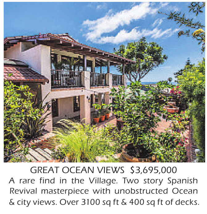 GREAT OCEAN VIEWS $3,695,000 A rare find in the Village. Two story Spanish Revival masterpiece with unobstructed Ocean & city views. Over 3100 sq ft & 400 sq ft of decks.