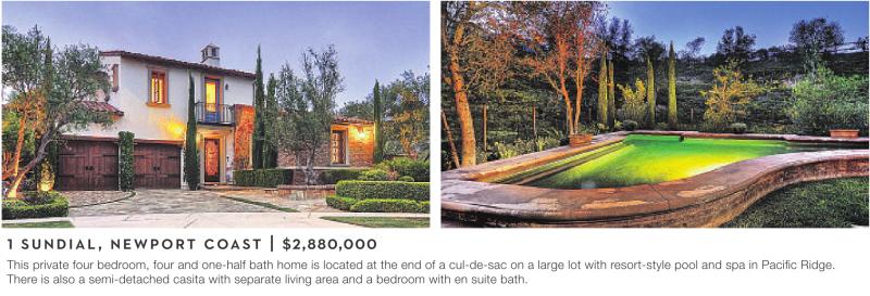 1 SUNDIAL, NEWPORT COAST | $2,880,000 This private four bedroom, four and one-half bath home is located at the end of a cul-de-sac on a large lot with resort-style pool and spa in Pacific Ridge. There is also a semi-detached casita with separate living area and a bedroom with en suite bath.