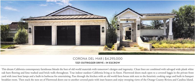 CORONA DEL MAR | $4,295,000 1321 OUTRIGGER DRIVE : IN ESCROW This dream California contemporary farmhouse blends the best of old world materials with tomorrow's designs and ingenuity. Clean lines are combined with salvaged wide plank white oak barn flooring and lime washed used brick walls throughout. True indoor outdoor California living at its finest. Fleetwood doors stack open to a covered loggia in the private front yard with inset heat lamps and a built-in barbecue for entertaining. Pass through the kitchen with an old world farm house sink next to the futuristic cooking range and built-in banquet breakfast room. Then stack the next set of Fleetwood doors out to another covered patio with inset heaters and enjoy sweeping views of the Orange County Riviera and Catalina Island.