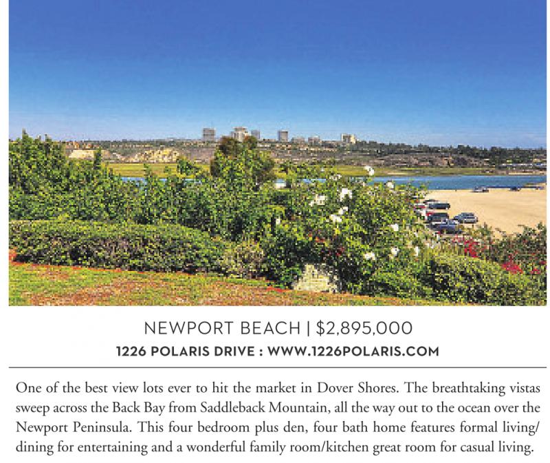 NEWPORT BEACH | $2,895,000 1226 POLARIS DRIVE : WWW.1226POLARIS.COM One of the best view lots ever to hit the market in Dover Shores. The breathtaking vistas sweep across the Back Bay from Saddleback Mountain, all the way out to the ocean over the Newport Peninsula. This four bedroom plus den, four bath home features formal living/ dining for entertaining and a wonderful family room/kitchen great room for casual living.