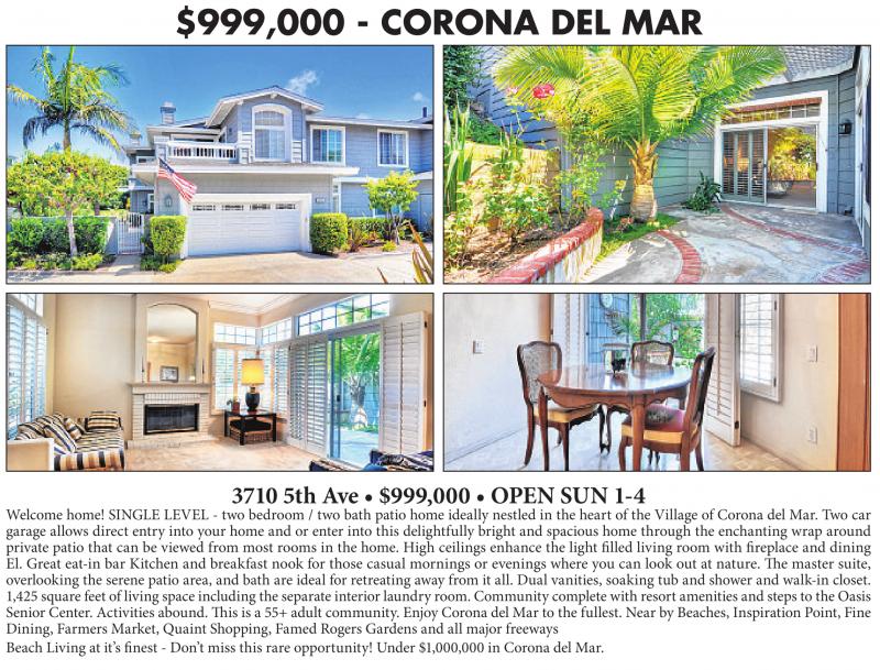 $999,000 - CORONA DEL MAR 3710 5th Ave • $999,000 • OPEN SUN 1-4 Welcome home! SINGLE LEVEL - two bedroom / two bath patio home ideally nestled in the heart of the Village of Corona del Mar. Two car garage allows direct entry into your home and or enter into this delightfully bright and spacious home through the enchanting wrap around private patio that can be viewed from most rooms in the home. High ceilings enhance the light filled living room with fireplace and dining El. Great eat-in bar Kitchen and breakfast nook for those casual mornings or evenings where you can look out at nature. The master suite, overlooking the serene patio area, and bath are ideal for retreating away from it all. Dual vanities, soaking tub and shower and walk-in closet. 1,425 square feet of living space including the separate interior laundry room. Community complete with resort amenities and steps to the Oasis Senior Center. Activities abound. This is a 55+ adult community. Enjoy Corona del Mar to the fullest. Near by Beaches, Inspiration Point, Fine Dining, Farmers Market, Quaint Shopping, Famed Rogers Gardens and all major freeways Beach Living at it’s finest - Don’t miss this rare opportunity! Under $1,000,000 in Corona del Mar.