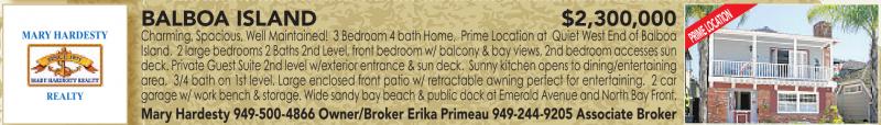 MARY HARDESTY REALTY BALBOA ISLAND $2,300,000 Charming, Spacious, Well Maintained! 3Bedroom 4bath Home, Prime Location at Quiet WestEnd of Balboa Island. 2largebedrooms2Baths2nd Level, frontbedroom w/ balcony&bayviews,2nd bedroomaccesses sun deck.Private GuestSuite 2ndlevelw/exteriorentrance&sun deck. Sunny kitchenopenstodining/entertaining area. 3/4 bath on 1st level. Large enclosed front patio w/ retractable awning perfect for entertaining. 2 car garage w/ work bench&storage.Wide sandybay beach &publicdockatEmerald Avenue andNorth BayFront. Mary Hardesty 949-500-4866 Owner/Broker Erika Primeau 949-244-9205 Associate Broker