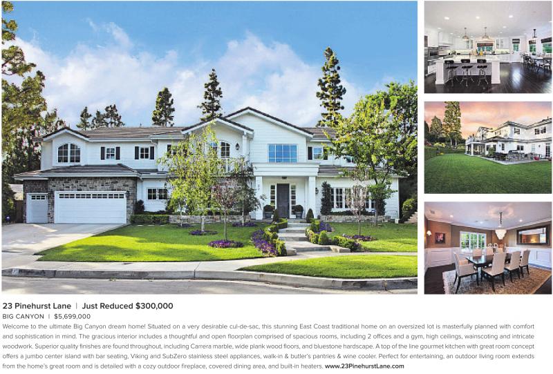 23 Pinehurst Lane | Just Reduced $300,000 BIG CANYON | $5,699,000 Welcome to the ultimate Big Canyon dream home! Situated on a very desirable cul-de-sac, this stunning East Coast traditional home on an oversized lot is masterfully planned with comfort and sophistication in mind. The gracious interior includes a thoughtful and open floorplan comprised of spacious rooms, including 2 offices and a gym, high ceilings, wainscoting and intricate woodwork. Superior quality finishes are found throughout, including Carrera marble,wide plank wood floors, and bluestone hardscape.Atop of the line gourmet kitchen with great room concept offers a jumbo center island with bar seating, Viking and SubZero stainless steel appliances, walk-in & butler’s pantries & wine cooler. Perfect for entertaining, an outdoor living room extends from the home’s great room and is detailed with a cozy outdoor fireplace, covered dining area, and built-in heaters. www.23PinehurstLane.com