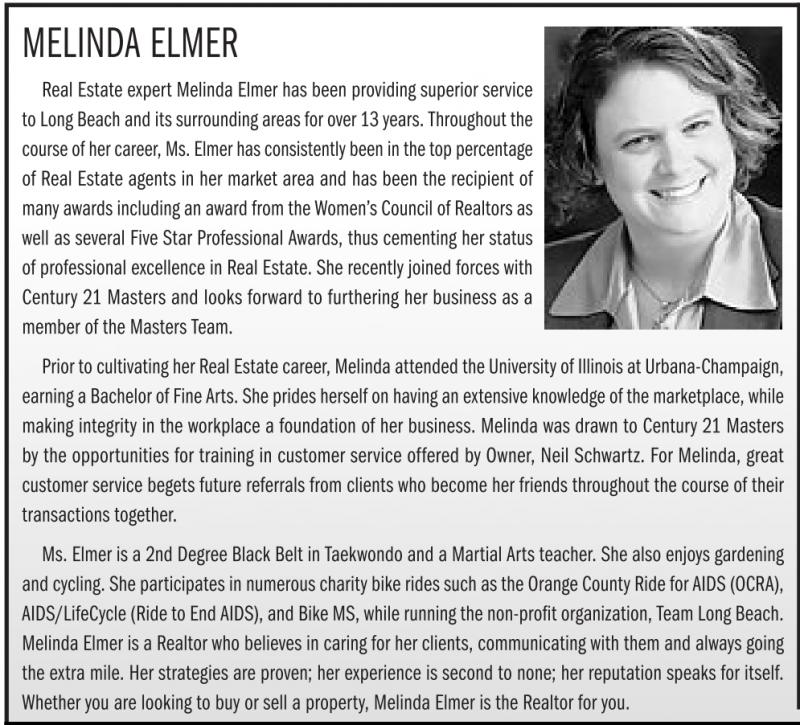 MELINDA ELMER Real Estate expert Melinda Elmer has been providing superior service to Long Beach andits surroundingareasfor over13years.Throughoutthe course of hercareer, Ms.Elmer hasconsistently been in thetop percentage of Real Estate agents in her market area and has been the recipient of many awards includinganaward from theWomen’s CouncilofRealtorsas well as several Five Star Professional Awards, thus cementing her status of professional excellence in Real Estate. She recently joined forces with Century 21 Masters and looks forward to furthering her business as a member of the Masters Team. Prior to cultivating herRealEstate career, Melinda attended theUniversityofIllinois at Urbana-Champaign, earningaBachelor of Fine Arts.She pridesherself on having an extensive knowledgeofthe marketplace,while making integrity in the workplace a foundation of her business. Melinda was drawn to Century 21 Masters by the opportunities for training in customer service offered by Owner, Neil Schwartz. For Melinda, great customer service begets future referrals from clients who become her friends throughout the course of their transactions together. Ms. Elmer is a 2nd Degree Black Belt in Taekwondo and a Martial Arts teacher. She also enjoys gardening andcycling. Sheparticipatesinnumerous charitybike ridessuch as theOrangeCountyRide forAIDS(OCRA), AIDS/LifeCycle(Ride to EndAIDS),and Bike MS, whilerunning thenon-profit organization,TeamLongBeach. Melinda Elmer is a Realtor who believes in caring for her clients, communicating with them and always going the extra mile. Her strategies are proven; her experience is second to none; her reputation speaks for itself. Whether you are looking to buy or sell a property, Melinda Elmer is the Realtor for you.