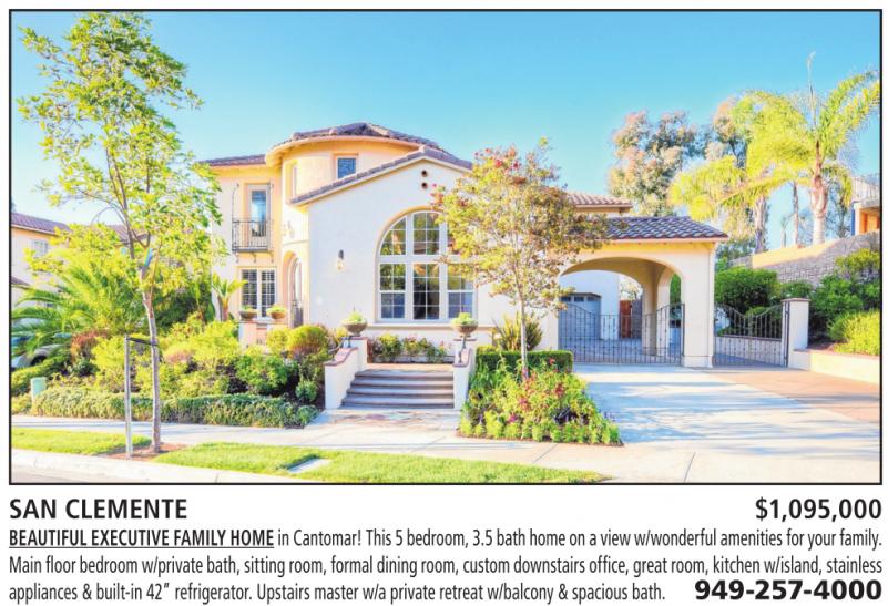 SAN CLEMENTE $1,095,000 BEAUTIFULEXECUTIVE FAMILY HOME in Cantomar!This 5bedroom,3.5 bath home on avieww/wonderful amenitiesfor your family.