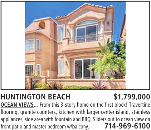 HUNTINGTON BEACH $1,799,000 OCEAN VIEWS... From this 3-story home on the first block! Travertine flooring, granite counters, kitchen with larger center island, stainless appliances,sideareawithfountain andBBQ.Sliders outtoocean view on frontpatio andmasterbedroom w/balcony. 714-969-6100