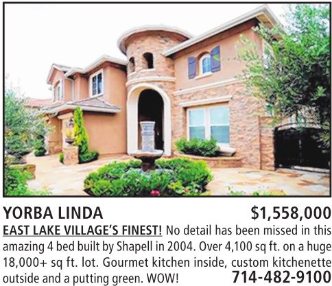 YORBA LINDA $1,558,000 EAST LAKE VILLAGE’S FINEST! No detail has been missed in this amazing4bed builtbyShapell in 2004.Over4,100 sq ft.onahuge 18,000+ sqft. lot. Gourmet kitchen inside, custom kitchenette outsideand aputting green. WOW! 714-482-9100