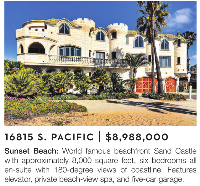 Sunset Beach: World famous beachfront Sand Castle with approximately 8,000 square feet, six bedrooms all en-suite with 180-degree views of coastline. Features elevator, private beach-view spa, and five-car garage.