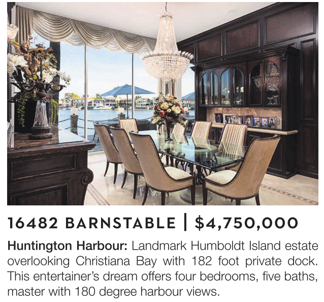 Huntington Harbour: Landmark Humboldt Island estate overlooking Christiana Bay with 182 foot private dock. This entertainer’s dream offers four bedrooms, five baths, master with 180 degree harbour views.