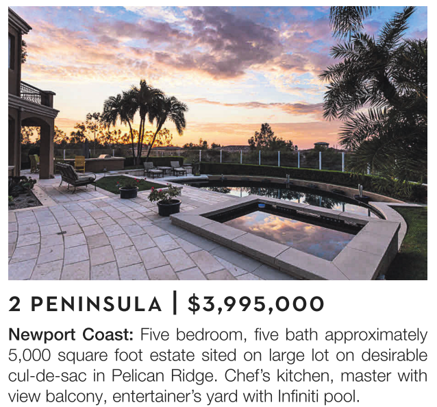 Newport Coast: Five bedroom, five bath approximately 5,000 square foot estate sited on large lot on desirable cul-de-sac in Pelican Ridge. Chef’s kitchen, master with view balcony, entertainer’s yard with Infiniti pool.
