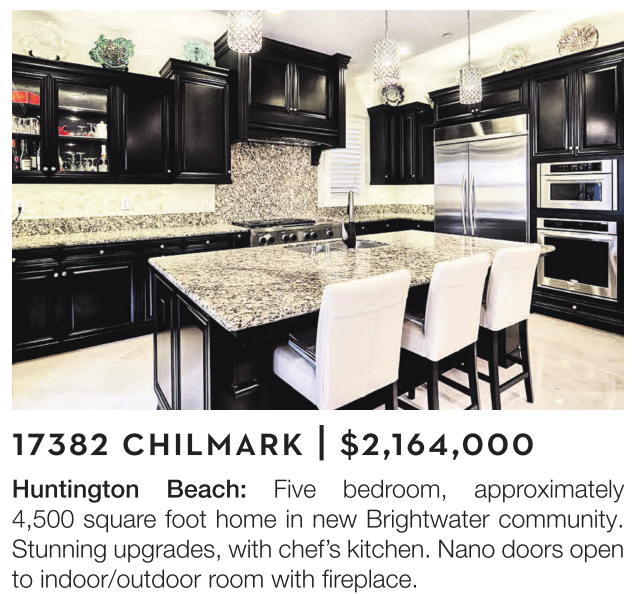 Huntington Beach: Five bedroom, approximately 4,500 square foot home in new Brightwater community. Stunning upgrades, with chef’s kitchen. Nano doors open to indoor/outdoor room with fireplace.