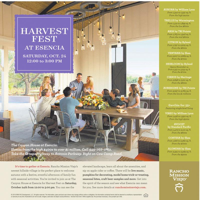 elevated landscape, learn all about the amenities, and sip on apple cider or coffee. There will be live music, pumpkinsfor decorating, model home trick-or-treating, seasonal bites, craft beer samples and more. Get into the spirit of the season and see what Esencia can mean for you. See more details at ranchomissionviejo.com.