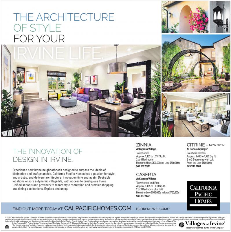 THE ARCHITECTURE OF STYLE FOR YOUR IRVINE LIFE. THE INNOVATION OF DESIGN IN IRVINE. Experience new Irvine neighborhoods designed to surpass the ideals of distinction and craftsmanship. California Pacific Homes has a passion for style and artistry, and delivers architectural innovation time and again. Desirable locations ensure a dynamic village life, with access to prestigious Irvine Unified schools and proximity to resort-style recreation and premier shopping and dining destinations. Explore and enjoy. ZINNIA At Cypress Village Townhomes Approx. 1,163 to 1,531 Sq. Ft. 2to4Bedrooms From the High$400,000s to Low $600,000s 949.502.5373 CASERTA At Cypress Village Townhomes and Flats Approx. 1,165 to 1,810 Sq. Ft. 2to3Bedrooms plus Loft From the Low $500,000s to Low $700,000s 949.387.9665 CITRINE - NOWOPEN! At Portola Springs ® Courtyard Homes Approx. 1,460 to 1,792 Sq.Ft. 3to3Bedrooms withLoft From the Low $600,000s 949.336.8168 FIND OUT MORE TODAY AT: CALPACIFICHOMES.COM BROKERS WELCOME* ©2015CaliforniaPacific Homes. *Payment of Broker commission at any California Pacific Homes neighborhood requires Broker to accompany and registerprospective homebuyer on their first visit to each neighborhood of interest and comply with Seller’sBroker Cooperation Agreement. All buyers mustbeprequalifiedwithCaliforniaPacificHomespreferredlender.Pricesandproductavailabilityaresubjecttochangewithoutnotice.AsaresidentofIrvineyouautomaticallybecomeamemberoftheHomeowner’sAssociation.Monthlyassociationduesmaintainthequalityofcommonareafacilities. Irvine is included in an AssessmentDistrict and Community Facilities (Mello Roos) District. Portola Springs ® and Cypress Village are planned communities developed by Irvine Community Development Company LLC, an affiliate of The Irvine Company LLC. Portola Springs ® is atrademark of The Irvine Company LLC. “Masterfully Planned by the Irvine Company” means that the Irvine Company created the master land plan for all Irvine Company communities. The “master land plan” includes the overall entitlement and design of each communitybut does not include the design, construction and sale of homes. The design, construction and sale of homes is the sole responsibility of community builders. The Irvine Company is notdesigning, constructing or offering homes for sale in any community. Modelphotography forillustrative purposes only. BRE license #01277135.
