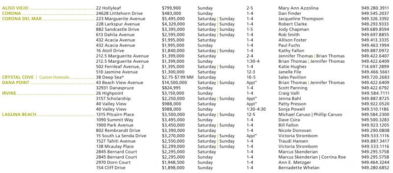 ALISO VIEJO ...................................................... 22 Hollyleaf $799,900 Sunday 2-5 Mary Ann Azzolina 949.280.3911 CORONA............................................................ 24628 Littlehorn Drive $483,000 Sunday 1-4 Dan Finder 949.545.2037 CORONA DEL MAR ........................................... 223 Marguerite Avenue $5,495,000 Saturday | Sunday 1-4 Jacqueline Thompson 949.326.3392 228 Larkspur Avenue $4,329,000 Saturday | Sunday 1-4 Robert Clarke 949.293.9333 882 Sandcastle Drive $3,395,000 Saturday | Sunday 1-5 Jody Chapman 949.689.8594 613 Dahlia Avenue $2,595,000 Saturday | Sunday 1-4 Rob Smith 949.697.8855 432 Acacia Avenue $1,995,000 Saturday 1-4 Allison Foster 949.413.3335 432 Acacia Avenue $1,995,000 Sunday 1-4 Paul Fuchs 949.463.1994 16 Atoll Drive $1,840,000 Saturday | Sunday 1-4 Kathy Fallon 949.887.0972 212.5 Marguerite Avenue $1,399,000 Saturday 2-4 Jennifer Thomas | Brian Thomas 949.422.6407 212.5 Marguerite Avenue $1,399,000 Sunday 1:30-4 Brian Thomas | Jennifer Thomas 949.422.6409 502 Fernleaf Avenue, 2 $1,395,000 Saturday | Sunday 1-4 Katie Hughes 714.697.2899 510 Jasmine Avenue $1,300,000 Saturday 12-3 Janelle File 949.466.5661 CRYSTAL COVE | Custom Homesite..................... 38 Deep Sea* $2.75-$7.99 MM Saturday 10-5 Sales Pavilion 949.720.2683 DANA POINT ..................................................... 43 Beach View Avenue $14,500,000 Saturday | Sunday Appt* Brian Thomas | Jennifer Thomas 949.422.6409 32931 Danaspruce $824,995 Sunday 1-4 Scott Panning 949.422.6792 IRVINE................................................................ 26 Highpoint $3,150,000 Sunday 1-4 Craig Valli 949.584.7111 3157 Scholarship $2,250,000 Saturday | Sunday Appt* Jenna Bahl 949.887.8725 40 Valley View $988,000 Saturday Appt* Patty Presson 949.922.0520 40 Valley View $988,000 Sunday 1:30-4:30 Sonja Powell 949.510.1186 LAGUNA BEACH................................................ 1315 Pitcairn Place $3,500,000 Saturday | Sunday 12-5 Michael Caruso | Phillip Caruso 949.584.2300 1090 Summit Way $3,495,000 Sunday 1-4 Dave Csira 949.500.3283 1900 Park Avenue $3,450,000 Saturday | Sunday 1-4 Bill Fallon 949.923.1205 802 Rembrandt Drive $3,390,000 Saturday 1-4 Nicole Donovan 949.290.0808 15 South La Senda Drive $3,270,000 Saturday | Sunday Appt* Victoria Strombom 949.533.1116 1527 Tahiti Avenue $2,550,000 Saturday | Sunday 1-4 Traudi Hansen 949.887.3417 138 Mcaulay Place $2,299,000 Saturday | Sunday 1-4 Victoria Strombom 949.533.1116 2845 Bernard Court $2,295,000 Saturday 1-4 Marcus Skenderian 949.295.5758 2845 Bernard Court $2,295,000 Sunday 1-4 Marcus Skenderian | Corrina Roe 949.295.5758 2970 Dorn Court $1,948,500 Sunday 1-4 Ann E. Metzger 949.464.3244 154 Cliff Drive $1,898,000 Sunday 1-4 Bernadette Whelan 949.280.6852