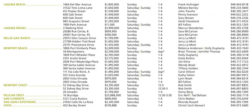 LAGUNA BEACH................................................ 1464 Del Mar Avenue $1,845,000 Sunday 1-4 Frank Hufnagel 949.444.8718 31522 Toto Loma Lane $1,650,000 Saturday | Sunday 1-4 Melane Barney 949.233.5840 412 Poplar Street $1,549,000 Sunday 1-4 John Treviño 949.395.2417 600 Oak Street $1,449,000 Saturday 1-4 Penny Svenson 949.632.2252 600 Oak Street $1,449,000 Sunday 1-4 Gary Boisen 949.274.2236 983 Acapulco Street $1,295,000 Sunday 1-4 Heidi Cleveland 949.371.4333 1900 Park Avenue $11,500 Saturday | Sunday 1-4 Bill Fallon 949.923.1205 LAGUNA NIGUEL .............................................. 3 Walking Stick $3,999,000 Saturday 1-4 Marcus Skenderian 949.295.5758 29286 Rue Cerise, 8 $609,900 Sunday 1-4 Sara McCartan 949.280.8900 29301 Rue Cerise, 45 $590,000 Sunday 1-4 Sara McCartan 949.280.8900 NELLIE GAIL RANCH ......................................... 25972 Glen Canyon Drive $1,799,999 Sunday 1-4 Jerry La Mott 949.472.9191 27798 Hidden Trail Road $1,695,000 Saturday 1-4 Jerry La Mott 949.472.9191 25751 Prairestone Drive $1,435,000 Saturday | Sunday 1-4 Jerry La Mott 949.472.9191 NEWPORT BEACH ............................................. 1806 Port Kimberly Place $2,699,000 Sunday 1-4 Rebecca Anderson | Holly Duplanty 949.433.1943 34 Montgomery $2,599,000 Saturday | Sunday Appt* Brian Thomas | Jennifer Thomas 949.422.6409 1859 Port Wheeler Place $2,595,000 Sunday 1-4 Holly Duplanty 949.300.5118 2351 Aralia Street $2,175,000 Sunday 1-4 Katie Rollins 949.293.0594 2036 Port Weybridge Place $1,695,000 Sunday 1-4 Jim Kline 949.717.7123 369 Santa Isabel Avenue $1,495,000 Saturday 1-4 Wendy Noah 949.422.0912 369 Santa Isabel Avenue $1,495,000 Sunday 1-4 Tiffany Holden 949.300.2744 111 Via Lido Nord, A $1,495,000 Saturday | Sunday Appt* Carol Allison 949.302.0220 553 Vista Grande $1,025,000 Saturday | Sunday 1-4 Kathy Fallon 949.887.0972 2603 Vista Ornada $979,000 Saturday 1-4 Lynn Noah 949.584.8214 2603 Vista Ornada $979,000 Sunday 1-4 Bill Fallon 949.923.1205 NEWPORT COAST ............................................. 52 Sidney Bay Drive $3,395,000 Saturday 12-5 Rob Smith 949.697.8855 52 Sidney Bay Drive $3,395,000 Sunday 12:30-5 Rob Smith 949.697.8855 20 Amador $1,799,000 Sunday 1-4 Ginny Berg 949.290.7309 PELICAN CREST ................................................. 16 Skyridge $23,888,000 Saturday 12:30-3:30 Eric Neff | Tad Baltzer 949.500.7119 SAN CLEMENTE................................................. 5121 Costa Rustico $849,000 Saturday 1-4 Chris Walker 949.370.6244 SAN JUAN CAPISTRANO.................................. 27432 Calle De La Rosa $2,245,000 Saturday 1-4 Rhonda Russell 949.395.7399 VISTA ................................................................. 452 Barsby Street $578,888 Sunday 1-4 Christi Cecil-Stewart 949.973.5685
