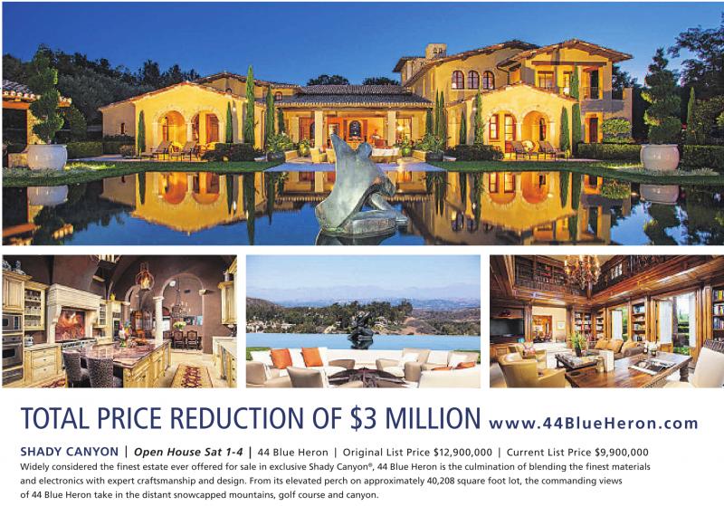 TOTAL PRICE REDUCTION OF $3 MILLION www.4 4BlueHeron.com SHADY CANYON | Open House Sat 1-4 | 44 Blue Heron | Original List Price $12,900,000 | Current List Price $9,900,000 Widely considered the finest estate ever offered for sale in exclusive Shady Canyon ® , 44 Blue Heron is the culmination of blending the finest materials and electronics with expert craftsmanship and design. From its elevated perch on approximately 40,208 square foot lot, the commanding views of 44 Blue Heron take in the distant snowcapped mountains, golf course and canyon.