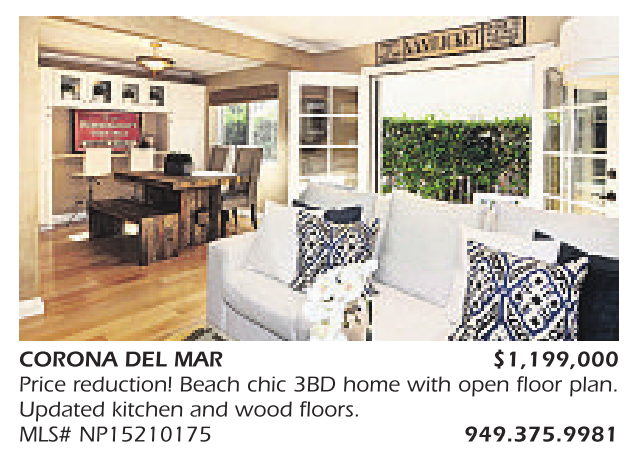 CORONA DEL MAR $1,199,000 Price reduction! Beach chic 3BD home with open floor plan. Updated kitchen and wood floors. MLS# NP15210175 949.375.9981