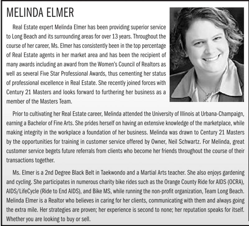 AIDS/LifeCycle(Ride to EndAIDS),and Bike MS, whilerunning thenon-profit organization,TeamLongBeach. Melinda Elmer is a Realtor who believes in caring for her clients, communicating with them and always going the extra mile. Her strategies are proven; her experience is second to none; her reputation speaks for itself. Whether you are looking to buy or sell.