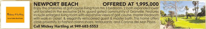 SevenGables Real Estate NEWPORT BEACH OFFERED AT 1,995,000 Enjoy the amenities of golf course living from this 3 bedroom, 2 bath expanded lower unit located in the exclusive 24 hr. guard gated community of Granville. Features include enlarged living room with expansive views of golf course, master bedroom with walk-in closet, & elegantly remodeled guest & master bath. This home offers close proximity to Fashion Island shops, restaurants, and Corona del Mar Plaza. Call Mickey Hartling at 949-683-5553