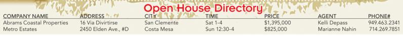 COMPANY NAME ADDRESS CITY TIME PRICE AGENT PHONE# Abrams Coastal Properties 16 Via Divirtirse San Clemente Sat 1-4 $1,395,000 Kelli Depass 949.463.2341 Metro Estates 2450 Elden Ave., #D Costa Mesa Sun 12:30-4 $825,000 Marianne Nahin 714.269.7851