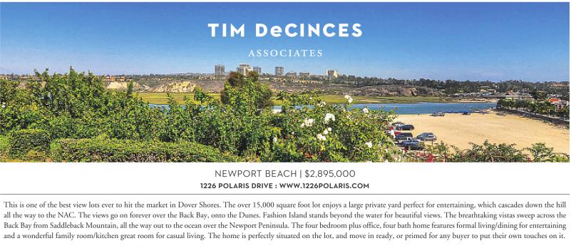 NEWPORT BEACH | $2,895,000 1226 POLARIS DRIVE : WWW.1226POLARIS.COM This is one of the best view lots ever to hit the market in Dover Shores. The over 15,000 square foot lot enjoys a large private yard perfect for entertaining, which cascades down the hill all the way to the NAC. The views go on forever over the Back Bay, onto the Dunes. Fashion Island stands beyond the water for beautiful views. The breathtaking vistas sweep across the Back Bay from Saddleback Mountain, all the way out to the ocean over the Newport Peninsula. The four bedroom plus office, four bath home features formal living/dining for entertaining and a wonderful family room/kitchen great room for casual living. The home is perfectly situated on the lot, and move in ready, or primed for any buyer to put their own touches on it.