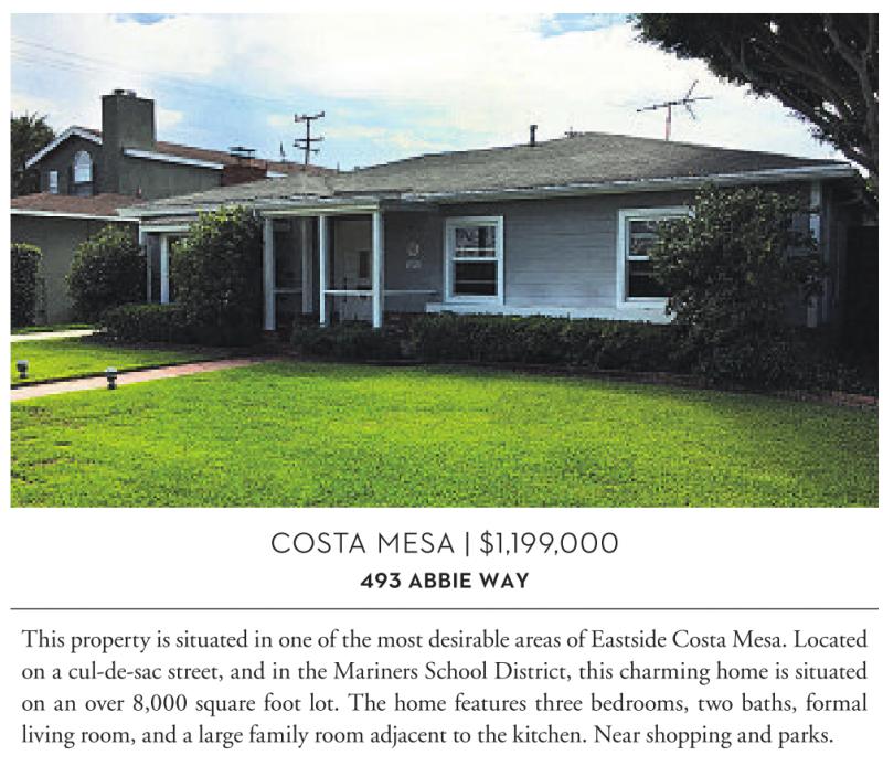 COSTA MESA | $1,199,000 493 ABBIE WAY This property is situated in one of the most desirable areas of Eastside Costa Mesa. Located on a cul-de-sac street, and in the Mariners School District, this charming home is situated on an over 8,000 square foot lot. The home features three bedrooms, two baths, formal living room, and a large family room adjacent to the kitchen. Near shopping and parks.