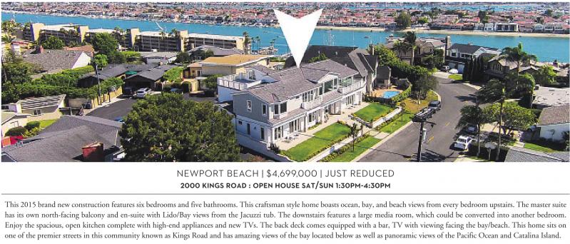 46 NEWPORT BEACH | $4,699,000 | JUST REDUCED 2000 KINGS ROAD : OPEN HOUSE SAT/SUN 1:30PM-4:30PM This 2015 brand new construction features six bedrooms and five bathrooms. This craftsman style home boasts ocean, bay, and beach views from every bedroom upstairs. The master suite has its own north-facing balcony and en-suite with Lido/Bay views from the Jacuzzi tub. The downstairs features a large media room, which could be converted into another bedroom. Enjoy the spacious, open kitchen complete with high-end appliances and new TVs. The back deck comes equipped with a bar, TV with viewing facing the bay/beach. This home sits on one of the premier streets in this community known as Kings Road and has amazing views of the bay located below as well as panoramic views of the Pacific Ocean and Catalina Island.