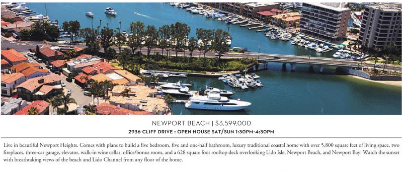 NEWPORT BEACH | $3,599,000 2936 CLIFF DRIVE : OPEN HOUSE SAT/SUN 1:30PM-4:30PM Live in beautiful Newport Heights. Comes with plans to build a five bedroom, five and one-half bathroom, luxury traditional coastal home with over 5,800 square feet of living space, two fireplaces, three-car garage, elevator, walk-in wine cellar, office/bonus room, and a 628 square foot rooftop deck overlooking Lido Isle, Newport Beach, and Newport Bay. Watch the sunset with breathtaking views of the beach and Lido Channel from any floor of the home.
