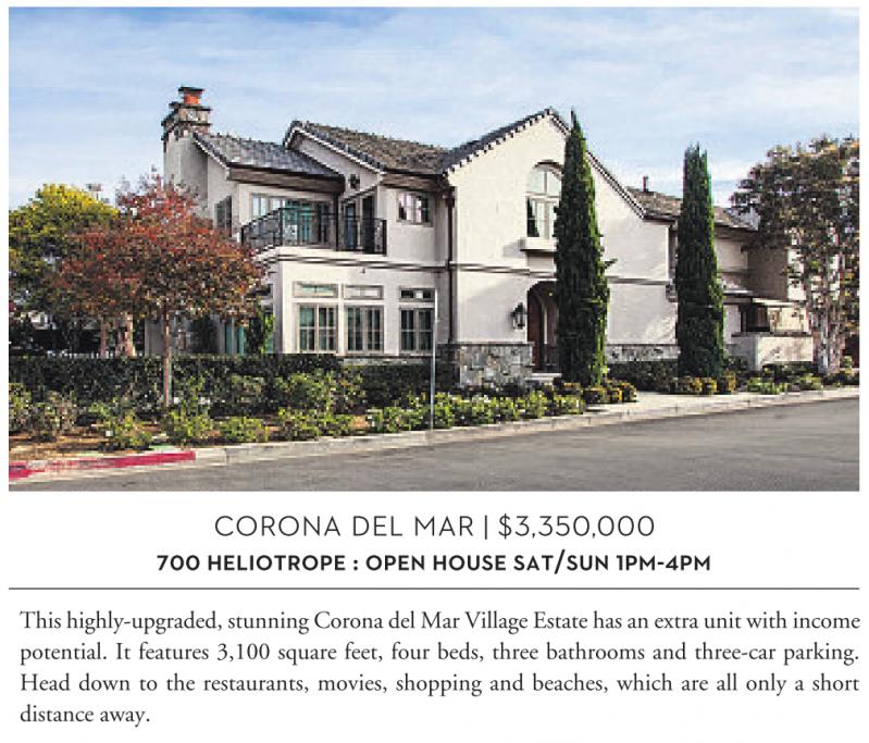 CORONA DEL MAR | $3,350,000 700 HELIOTROPE : OPEN HOUSE SAT/SUN 1PM-4PM This highly-upgraded, stunning Corona del Mar Village Estate has an extra unit with income potential. It features 3,100 square feet, four beds, three bathrooms and three-car parking. Head down to the restaurants, movies, shopping and beaches, which are all only a short distance away.