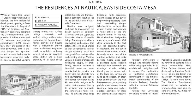 Pacific Real Estate groupishappytoannounce nautica, the new residential development opening in Eastside Costa Mesa in August of 2015. The Residences at nautica are 4 beautifully designed and crafted townhomes, comprised of 3 full bedrooms and 2.5 bathrooms and totaling approximately 2,050 square feet. They are priced in the high $800,000’s. With a creative design and spacious appeal, sizable bedrooms & bathrooms, expansive walkin closets, beautiful upstairs
