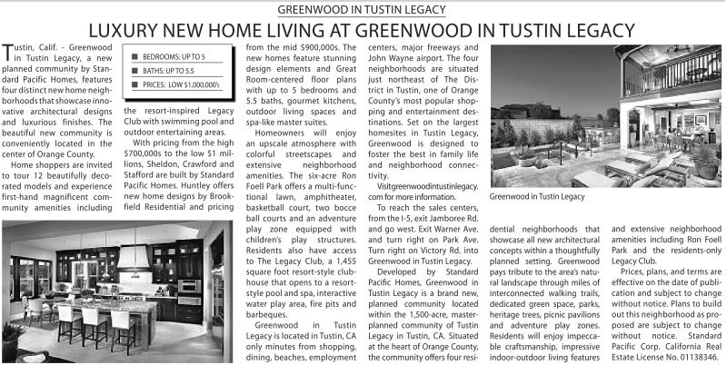 Calif. - Greenwood in Tustin legacy, a new planned community by standard Pacific Homes, features four distinctnew home neighborhoods thatshowcase innovative architectural designs and luxurious finishes. The beautiful new community is conveniently located in the center of orange County.
