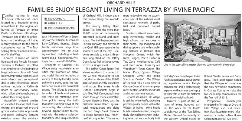 robert Charles Lesser and Company. their latest report noted that the Villages of irvine was the only new home community in Orange County to make the top-20 selling communities for the first half of 2015.