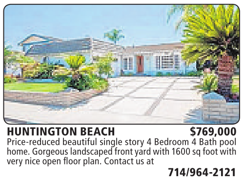 HUNTINGTON BEACH $769,000 Price-reduced beautiful single story 4Bedroom 4Bath pool home.Gorgeous landscapedfront yard with 1600 sq footwith very niceopenfloorplan. Contactusat 714/964-2121