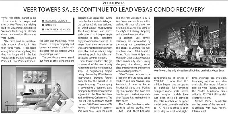 real estate market is on the rise in Las Vegas and sales at Veer Towers are helping lead the way. Pordes Residential Sales and Marketing has already closed on morethan 280 units at Veer Towers.