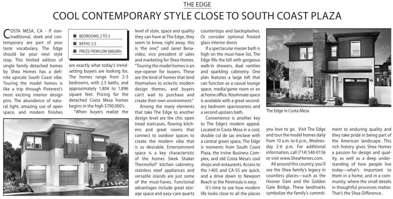 you love to go. Visit The Edge andtour the model homes daily from 10 a.m. to 6p.m., wednesday 2-6 p.m. For additional information, call (714) 540-0156 or visit www.sheaHomes.com.