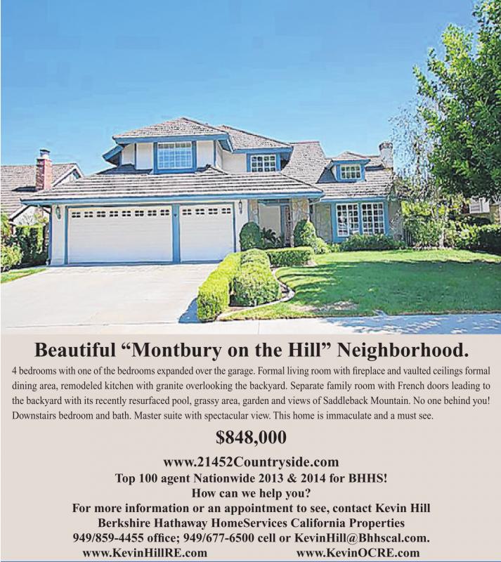Beautiful “Montbury on the Hill” Neighborhood. 4 bedrooms with one of the bedrooms expanded over the garage. Formal living room with fireplace and vaulted ceilings formal dining area, remodeled kitchen with granite overlooking the backyard. Separate family room with French doors leading to the backyard with its recently resurfaced pool, grassy area, garden and views of Saddleback Mountain. No one behind you! Downstairs bedroom and bath. Master suite with spectacular view. This home is immaculate and a must see. $848,000 www.21452Countryside.com Top 100 agent Nationwide 2013 & 2014 for BHHS! How can we help you? For more information or an appointment to see, contact Kevin Hill Berkshire Hathaway HomeServices California Properties 949/859-4455 office; 949/677-6500 cell or KevinHill@Bhhscal.com. www.KevinHillRE.com www.KevinOCRE.com