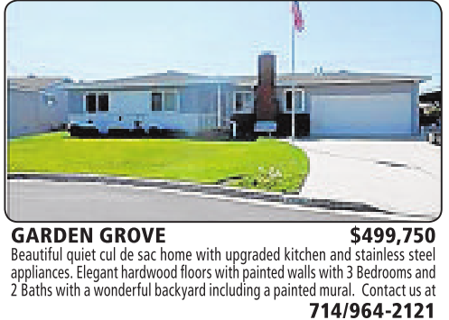 GARDEN GROVE $499,750 Beautiful quiet cul de sac home with upgraded kitchen and stainless steel appliances. Eleganthardwood floorswithpainted wallswith3Bedroomsand 2Baths with awonderfulbackyard including apainted mural. Contactusat 714/964-2121