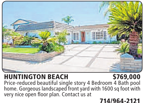 HUNTINGTON BEACH $769,000 Price-reduced beautiful single story 4Bedroom 4Bath pool home.Gorgeous landscapedfront yard with 1600 sq footwith very niceopenfloorplan. Contactusat 714/964-2121