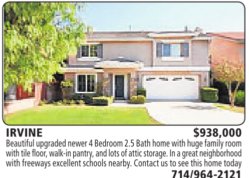 IRVINE $938,000 Beautifulupgraded newer4Bedroom 2.5Bathhome with huge family room with tile floor,walk-inpantry,and lots of atticstorage.Inagreat neighborhood with freewaysexcellent schoolsnearby. Contactustosee this home today 714/964-2121