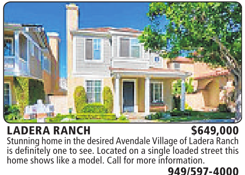 LADERA RANCH $649,000 Stunninghomeinthe desiredAvendaleVillage of Ladera Ranch is definitely one to see. Located onasingle loaded street this home showslikeamodel. Call for more information.
