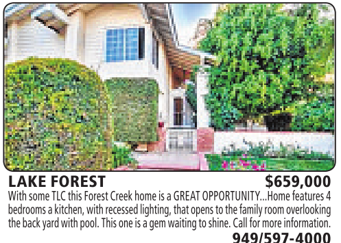LAKE FOREST $659,000 With some TLCthis Forest CreekhomeisaGREAT OPPORTUNITY...Home features 4 bedrooms akitchen,withrecessed lighting,thatopens to thefamily room overlooking thebackyardwithpool. This one is agem waiting to shine. Call for more information. 949/597-4000 See also