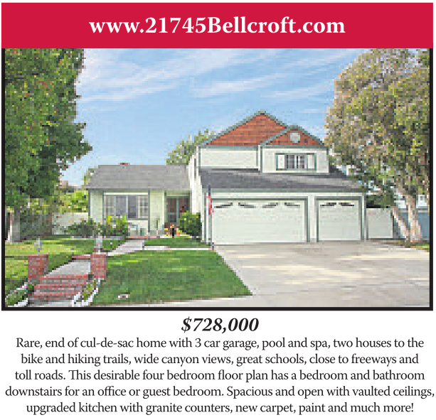 www.21745Bellcroft.com $728,000 Rare,end of cul-de-sac homewith3cargarage, pool andspa,two houses to the bike and hiking trails,wide canyon views, greatschools,close to freeways and toll roads. This desirablefourbedroom floor plan hasabedroom and bathroom downstairs foranofficeorguest bedroom. Spacious andopenwithvaulted ceilings, upgradedkitchen with granitecounters,new carpet, paintand much more!