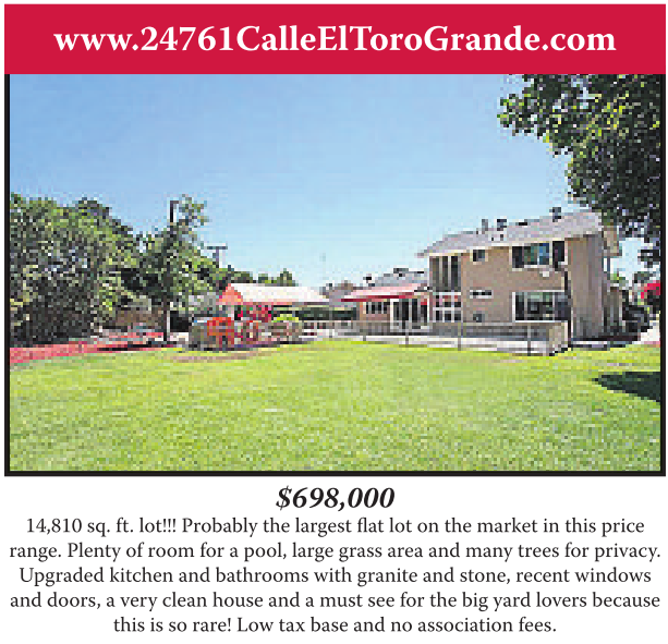 www.24761CalleElToroGrande.com $698,000 14,810 sq.ft. lot!!! Probably thelargest flatlot on themarketinthis price range. Plenty of room forapool, large grassareaand manytrees forprivacy. Upgraded kitchen and bathrooms with granite and stone, recent windows and doors,averyclean houseand amustsee forthe big yard lovers because this is so rare!Low taxbaseand no associationfees.